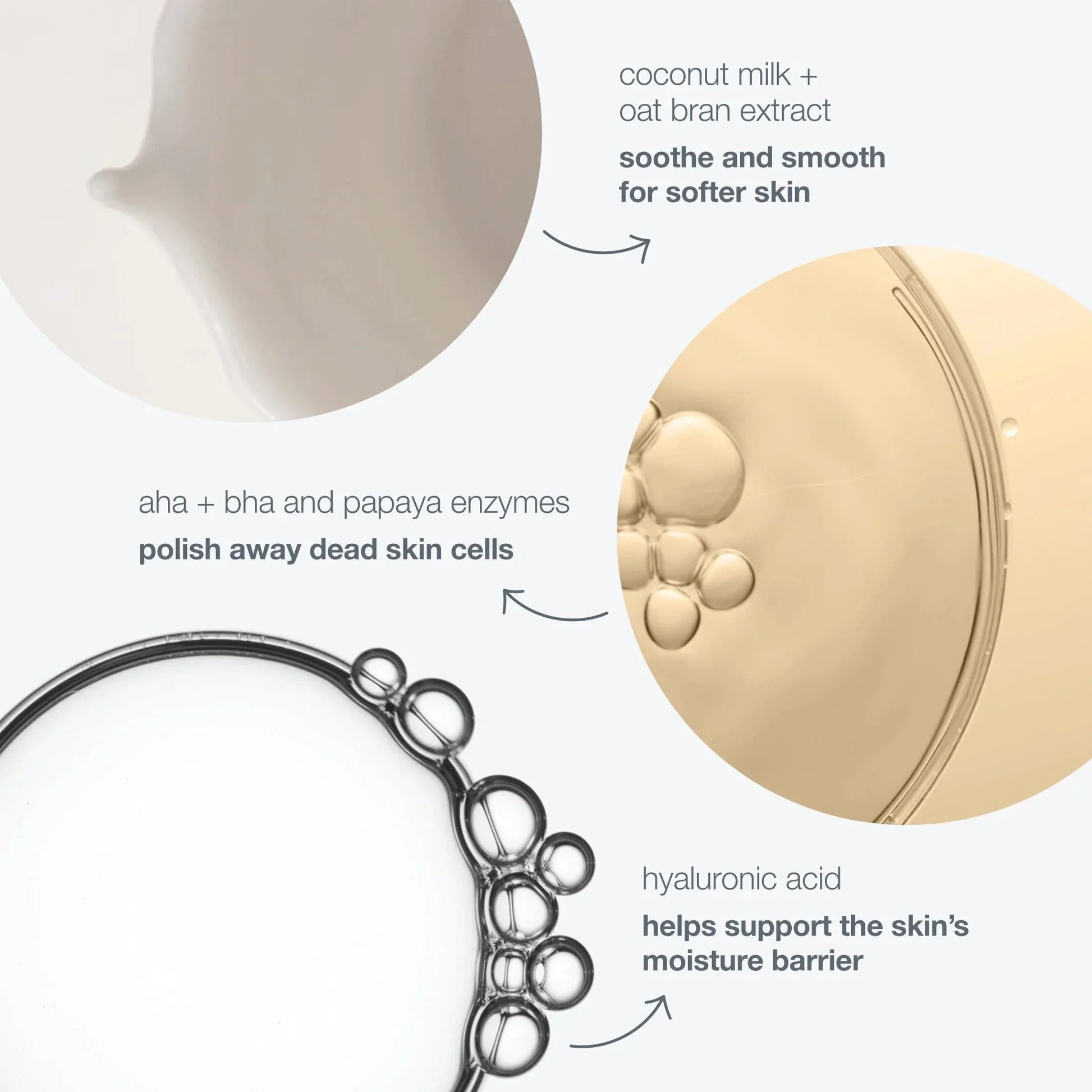 Vegan milky powder exfoliant with Oat and Coconut activates upon contact with water, releasing botanical extracts to help polish away dead skin cells. This gentle exfoliating powder and a blend with fruit-based Grape Extract and Arginine rich in Alpha Hydroxy Acids (AHAs) and Beta Hydroxy Acids (BHAs) work together with Coconut Milk for smoother, softer skin. Harvested from Papaya, Papain Extract provides exfoliating properties, helping to resurface skin. A naturally-derived plant Saccharide works with Atomized Sea Salt, rich in nourishing essential minerals Magnesium and Potassium, and Hyaluronic Acid to help support the skin’s moisture barrier. A blend with calming Oat Bran Extracts containing nourishing lipids replenishes and helps soothe skin. Regular exfoliation helps achieve softer, smoother, more vibrant skin.